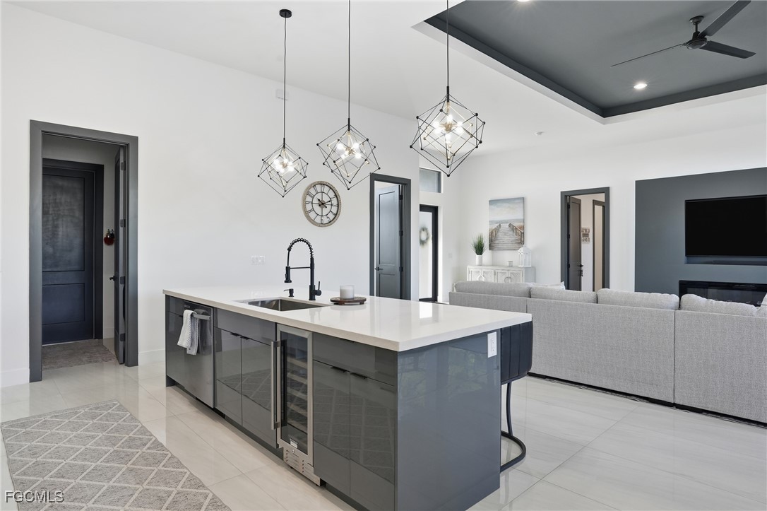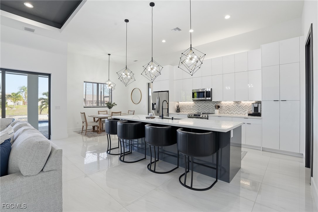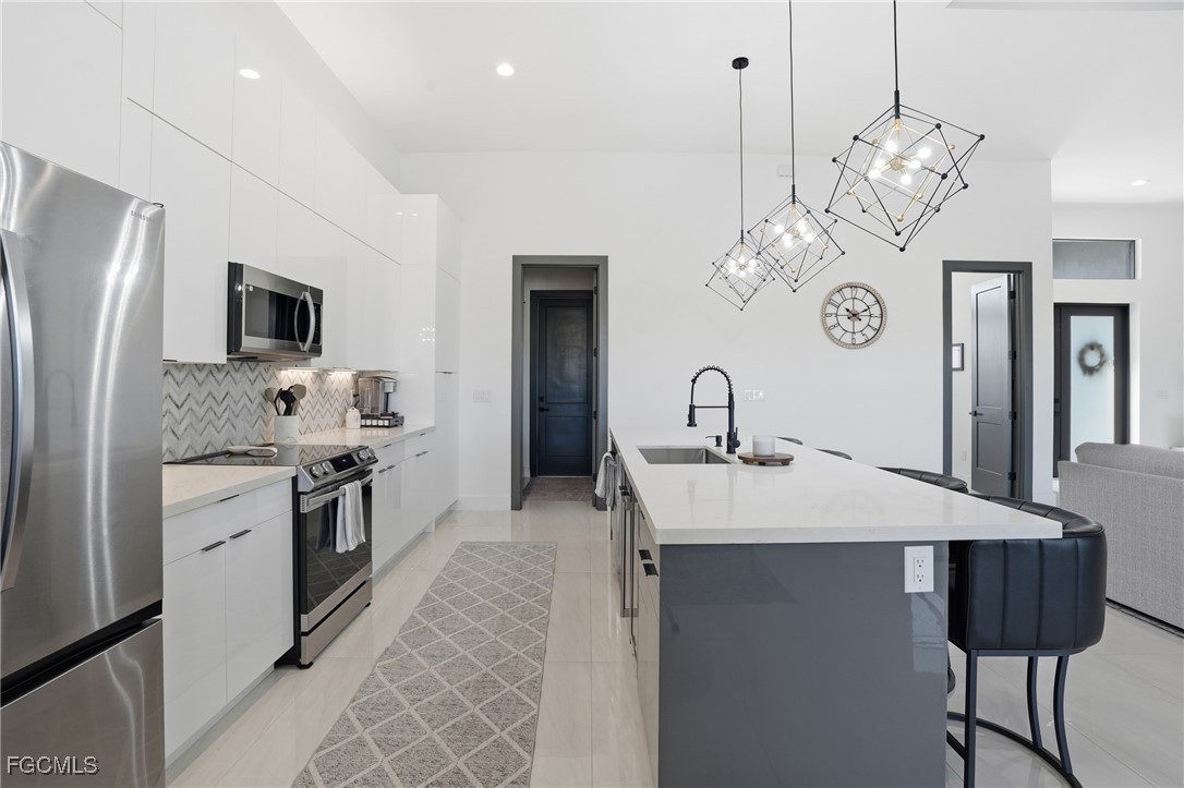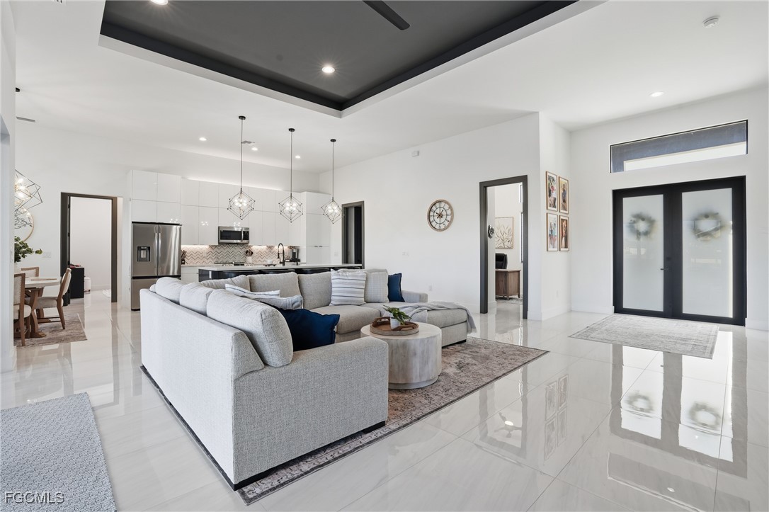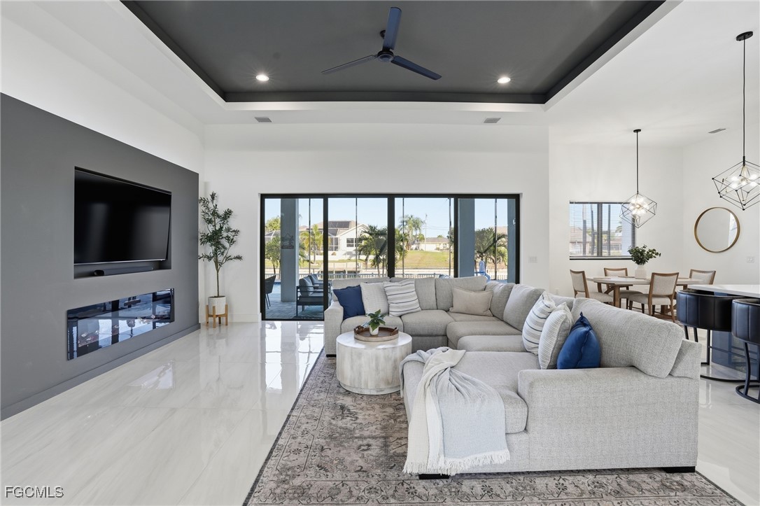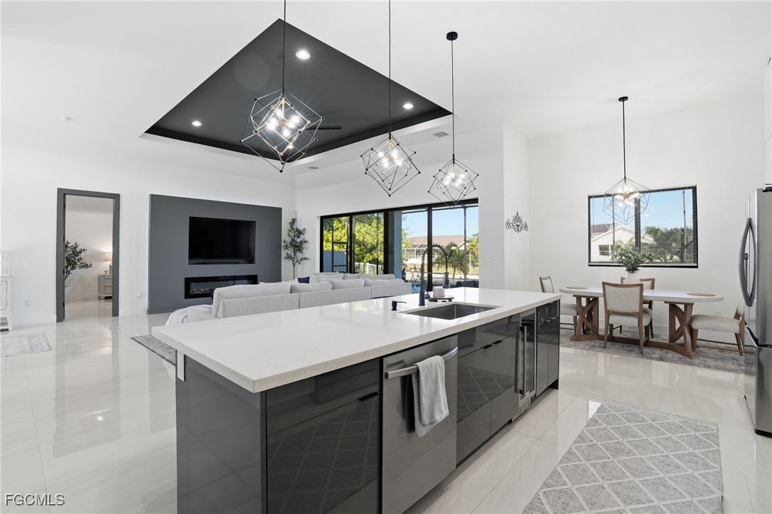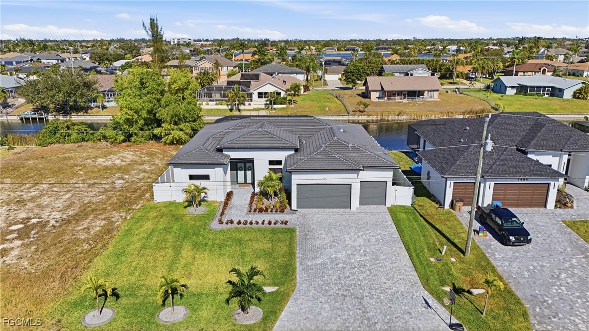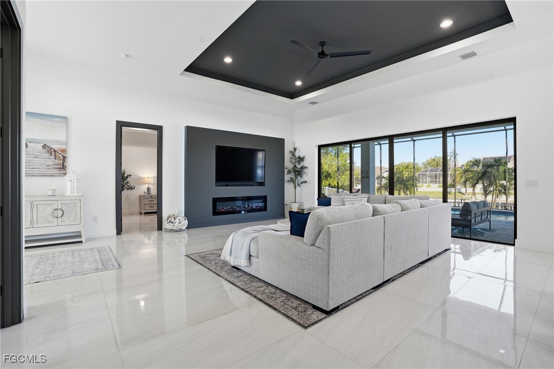 Experience modern Florida luxury in this exceptional 2024-built waterfront pool home, ideally situated along a scenic canal in Cape Coral. This contemporary single-family residence offers 4 bedrooms, 2 bathrooms, and a spacious 3-car attached garage, thoughtfully designed to blend style, comfort, and functionality. The open-concept living area is enhanced by dramatic 14-foot tray ceilings with LED accent lighting, creating an inviting yet sophisticated atmosphere. The custom European-style kitchen features sleek cabinetry and elegant quartz countertops, seamlessly complementing the home’s clean, modern design.