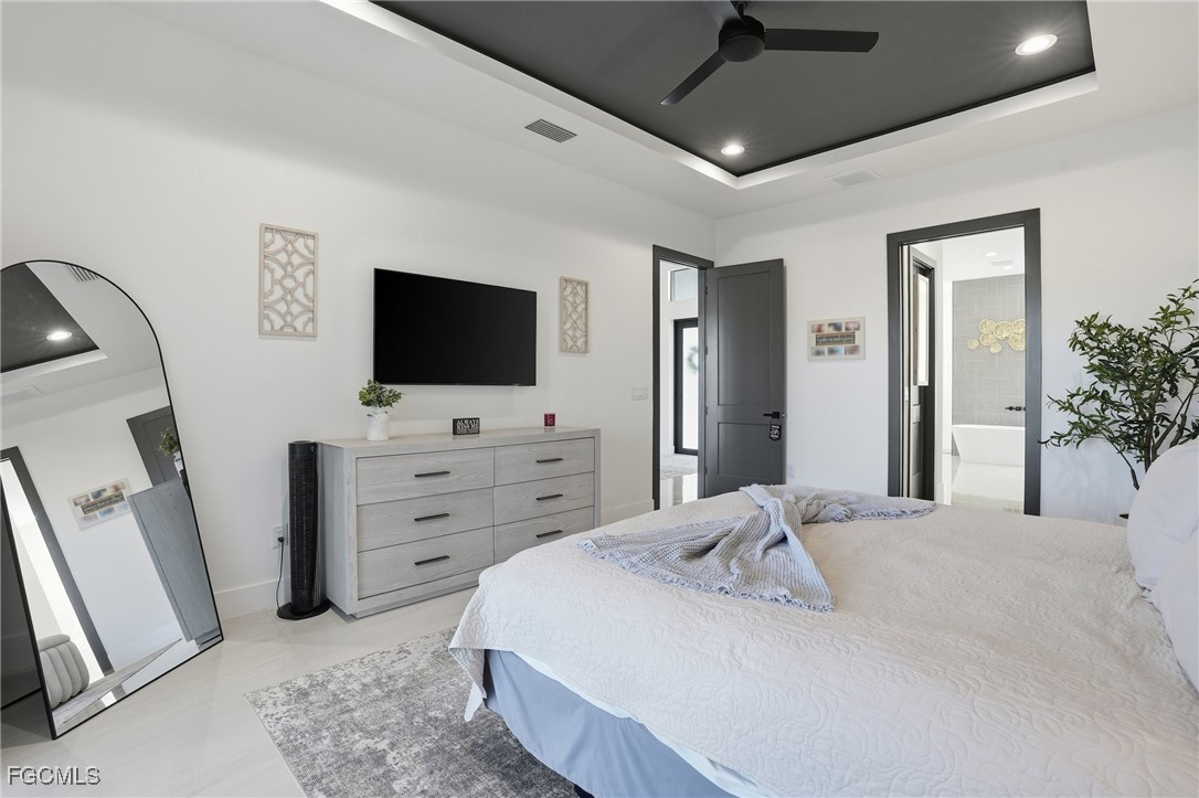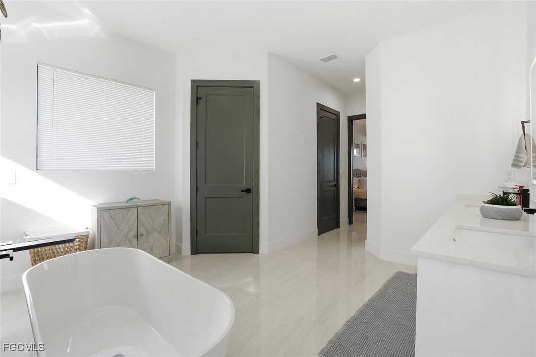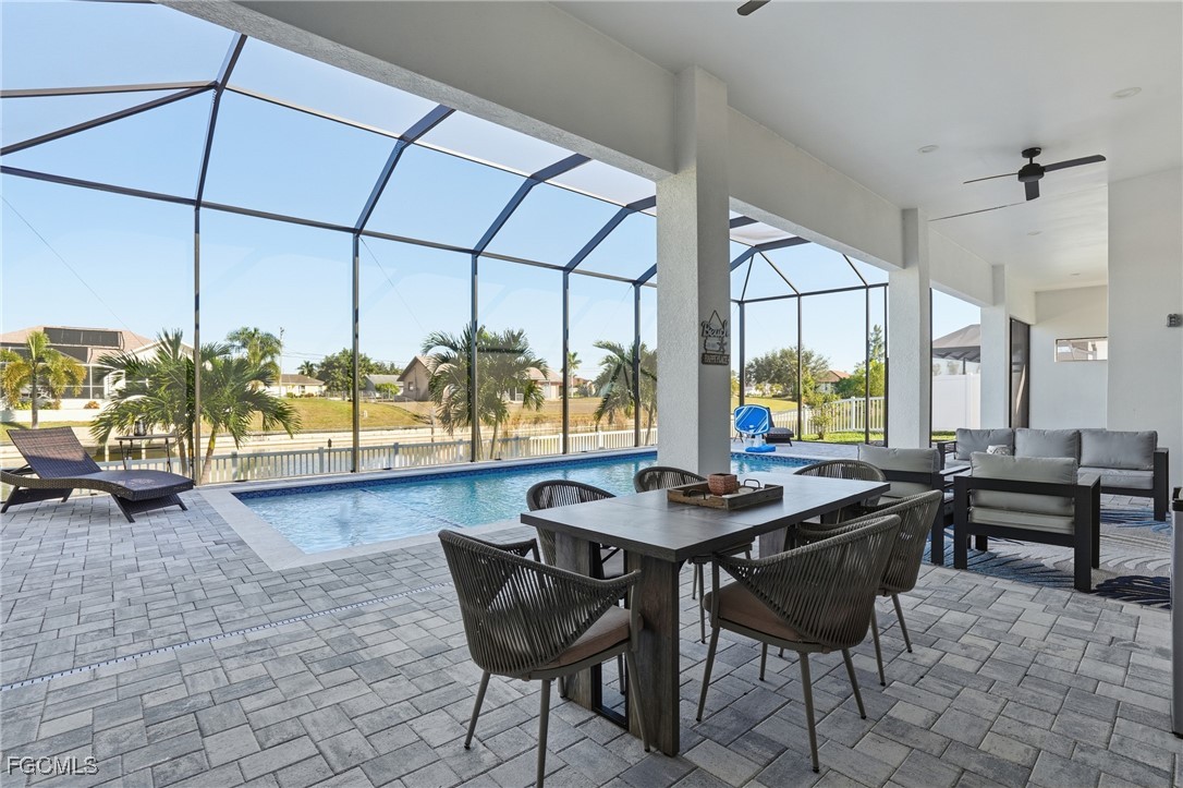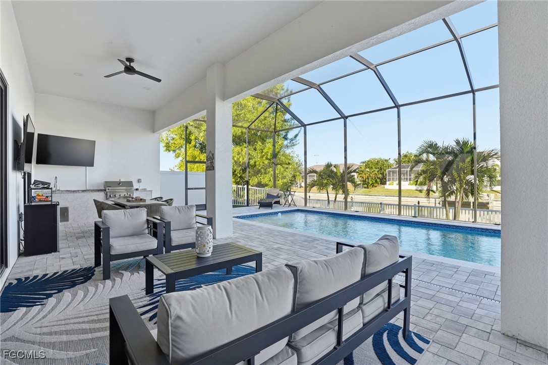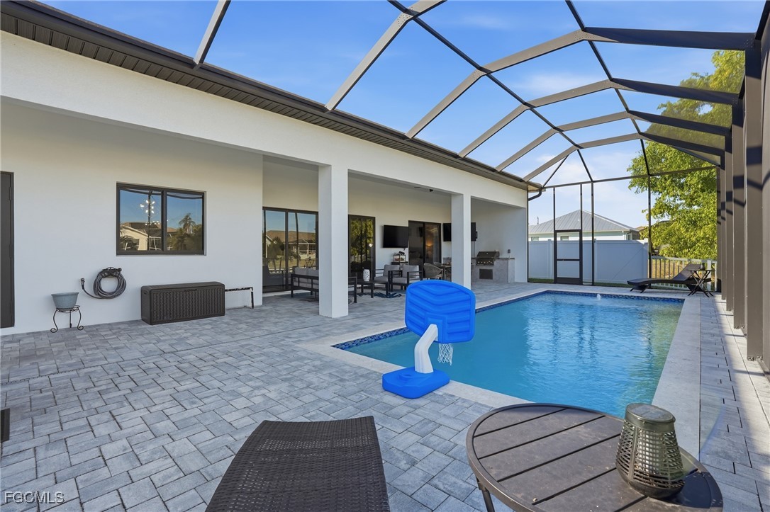 Outdoor living is elevated with a large screened-in pool enclosure, perfect for entertaining, complete with a built-in grill, full outdoor kitchen, and a brand-new pool heater for year-round enjoyment. The property is fully fenced along the seawall, offering security and peace of mind. The primary suite serves as a private retreat, featuring an oversized double vanity, freestanding soaking tub, custom spa-inspired shower, and spacious his-and-hers closets. Additional highlights include impact-resistant windows and doors throughout, tranquil waterfront views, and refined finishes that truly define upscale coastal living in Cape Coral.
