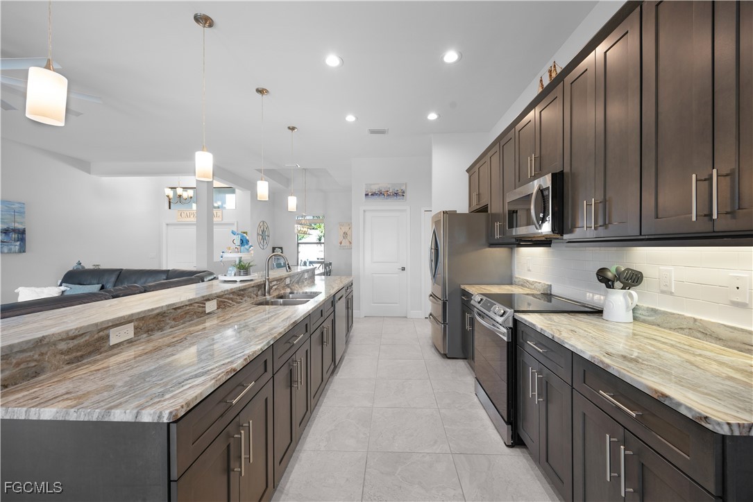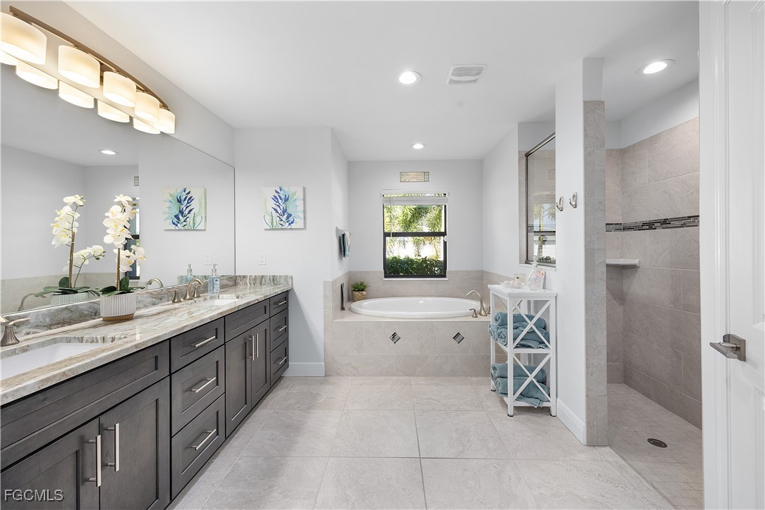 The kitchen is well-appointed with stainless steel appliances, granite countertops, under-cabinet lighting, and generous prep space—perfect for hosting family and friends. The spacious primary suite is a private retreat, featuring sliding glass doors to the pool, dual walk-in closets, double vanities, a soaking tub, and a separate walk-in shower.