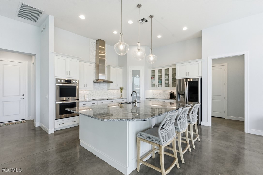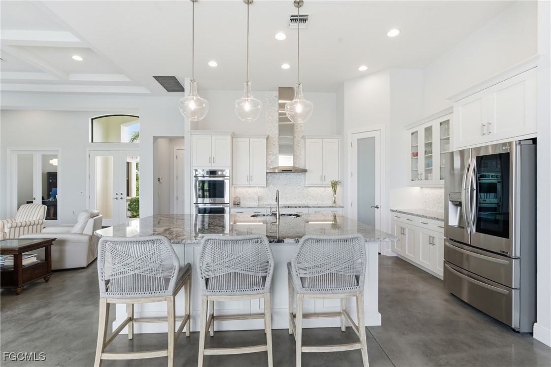 The home is centered around a expansive statement island and a sleek, modern layout, highlighted by hidden in-cabinet kitchen outlets that maintain clean lines throughout. Notable upgrades include a new full-home reverse osmosis system, one large electric roll-down screen for shaded outdoor comfort, and a full-home Generac generator for peace of mind.