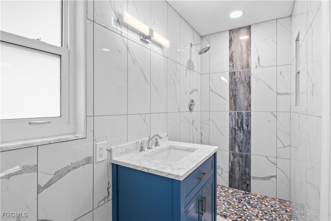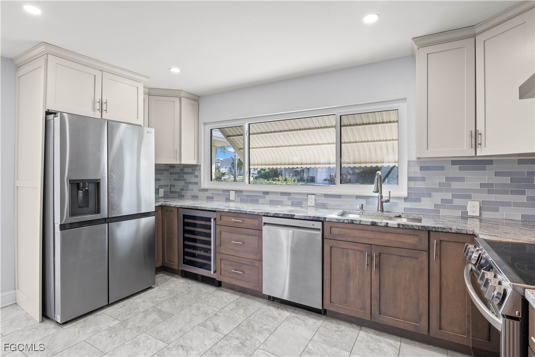 The home includes significant interior upgrades already completed, including a remodeled kitchen with new cabinetry, a large pantry cabinet, granite countertops, classic subway tile backsplash, newer stainless steel appliances, and a built-in wine cooler. The bathrooms have been updated, and new tile flooring runs throughout the home, creating a clean and cohesive look. Impact-resistant windows and a metal roof provide added storm protection and durability.