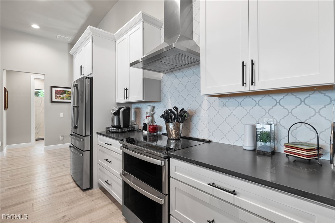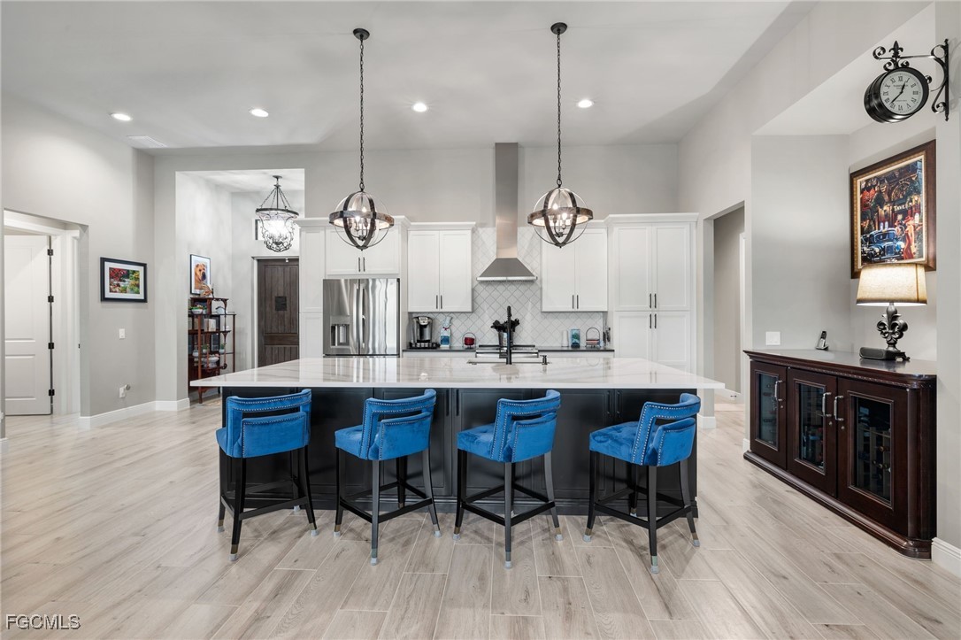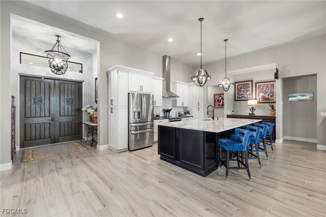 Step into this extraordinary 2021 built custom home and you’ll be amazed looking straight through a 20’ wall of glass to virtually unlimited water views which sets this location apart from every other home on the market. This elegant home is sure to please even the most discerning homeowner. 12’ tall ceilings and 10’ tall pocketing sliding glass doors floods the main living area with natural light. The gourmet kitchen is the heart of the home and includes a massive island, solid wood cabinetry with quartz countertops, upscale appliances including French door refrigerator, a double oven range with custom hood and the largest butler's panty you’ll find on any home this size. Three bedrooms including a second ensuite bedroom plus a den/office and three full baths offers plenty of room for family and friends. You'll feel like you are on vacation in the master suite with amazing water views through a large pocketing slider. The master bath offers a spa like experience and has two vanities on opposite sides of the room; one includes a huge linen cabinet. A large, tiled shower with bench highlights the room. The massive walk-in closet is conveniently connected to the oversized laundry room making laundry a breeze. The living area and master bedroom blends seamlessly with an over 600 square foot lanai complete with a pool bath. The picture window screen enclosure will not obstruct the endless views. The swimmer in the family will love the 39’ long heated pool which is great for swimming laps or simply floating around. This exquisitely built and decorated home could be purchased with the optional furnishings making the transition to a vacation rental or a seasonal residence effortless. Other features include a three-car garage with epoxy floor, tile flooring throughout, whole home reverse osmosis system and energy efficient spray foam insulation insures year-round comfort. You’ll also have one of the safest and most secure homes around. The 10’4’ elevation is well above the required flood elevation and the home has impact rated doors and windows throughout. The covered boat dock with 10K lb lift is thoughtfully offset on the lot so it does not obstruct the amazing views. With this attention to detail and the exquisite styling, nothing on the market will feel quite like this stunning tropical oasis. Come see for yourself. You will not be disappointed.