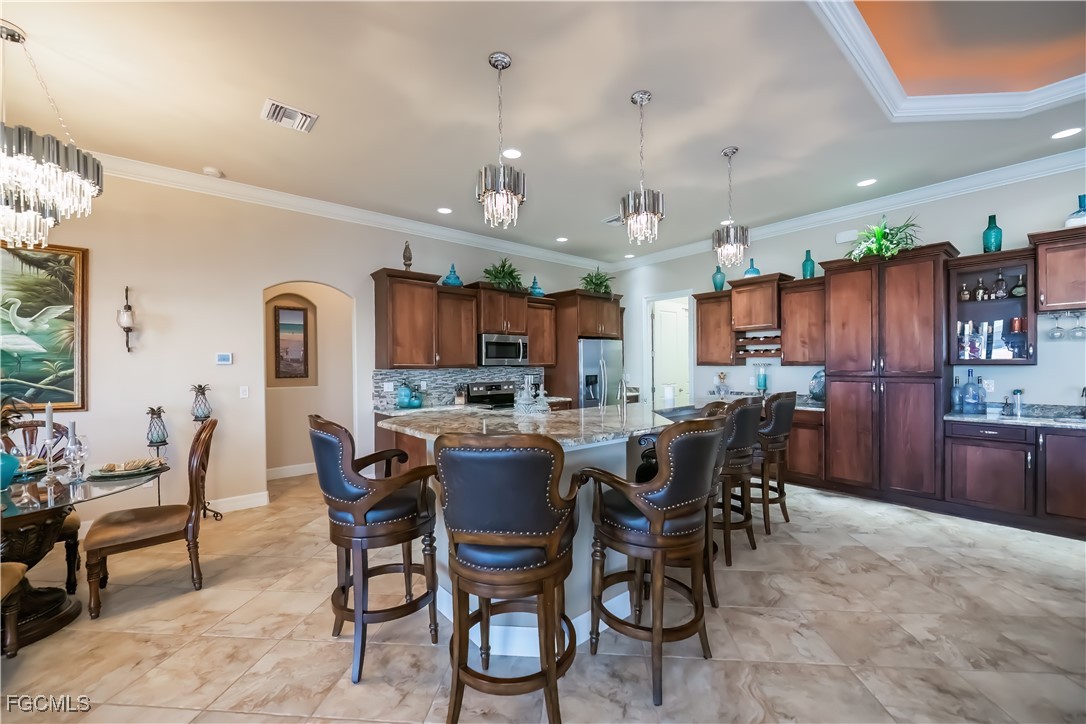 Welcome to Paradise! This Stunning Gulf Access home was built for entertaining! With the expansive great room and kitchen area, there is almost unlimited space for your guests. There is also a dedicated wet bar area. The den/office located right off the front door is large and offers plenty of windows for natural light and incredibly high ceilings. The owner's suite is a dream with pocking sliders to the pool area, crown molding, and back lit lighting in the tray ceiling and a bathroom that offers a luxurious spa feeling expansive dual vanities. If you're looking for a incredible outdoor living area, enjoy the huge lanai/pool area that features an outdoor kitchen with a separate island for additional seating. The boat dock has plenty of room for seating to watch our beautiful sunsets. A must see to believe! And just and added bonus...all assessments PAID! Schedule your showing today.