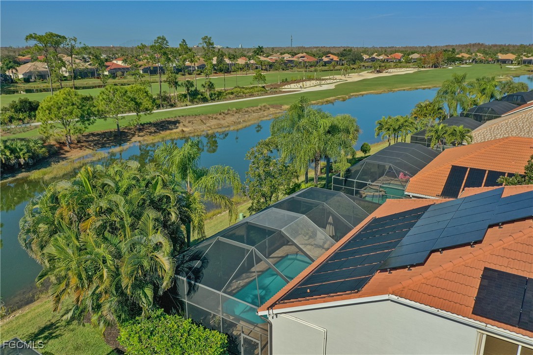 THIS 2,992SF MARTINIQUE MODEL HAS 3BRs+DEN+LOFT AND HAS MANY UPGRADES & NEWER ITEMS. NEWER ROOF AND NEW SOLAR POWER SYSTEM FOR THE ENTIRE HOME. Enjoy outdoor living with solar heated pool, pavered pool deck and secluded SUNSET views over pond toward 14th Hole of the Golf Course. Majestic high ceilings in foyer & living room really add to the space of the first floor. Large island kitchen upgraded with newer granite counters, newer appliances & 42 inch wood cabinets. Plenty of dining area with spacious breakfast nook along with formal dining room. Large master suite on ground floor with double walk-in closets. The master BR & Den both have wood floors. Tile in main living areas with carpets upstairs where you have two guest BRs a bath and a family room/loft. There is also a pool bath on ground level. Electric storm shutters for lanai & above front door with accordion shutters on windows. Baths are upgraded with quartz counters. New water softner for entire home. This home has a BUNDLED GOLF MEMBERSHIP INCLUDED and is located in the highly desirable resort community of Colonial Country Club which offers 18 holes of Championship Golf, Remodeled Clubhouse with Bar & Dining, Fitness Center, Community Pool, Tennis, Pickleball, Bocce, Miles of Walking Trails & MORE! Major Golf Course Renovation just completed with rave reviews! Remodeled community center, pro shop & cart barn about to re-open. This community benefits from a convenient location, high quality amenities and moderate fee structure.