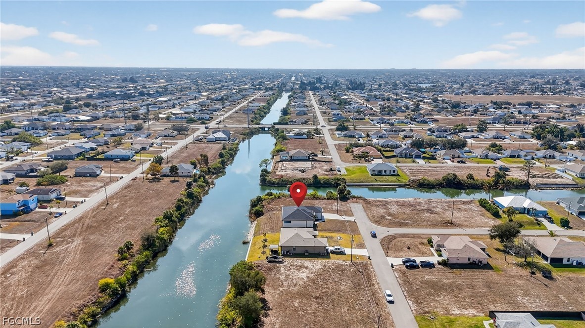 Brand New Construction home on Freshwater Canal. 3-bedrooms + den, 2 baths, 2 car garage. With a window and closet, the den can easily function as a fourth bedroom, home office, or guest room. NOT IN A FLOOD ZONE. The open floor plan features a modern kitchen with quartz countertops and waterfall island, 42" cabinets, sleek finishes, high ceilings, and large 24' x 48' marble mosaic tile throughout. Enjoy modern light fixtures and fans in every room. Step outside to your lanai and backyard overlooking the peaceful freshwater canal. The primary bedroom and living room offer direct access to the outdoor kitchen with a grill, granite countertop, a full size sink and small refrigerator. The 2 recessed wall mounted fireplaces create a cozy ambiance (one in the living room and the other in the primary bedroom). Epoxy floors in the garage and front porch. Includes washer, dryer and a laundry tub.