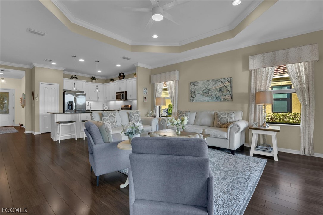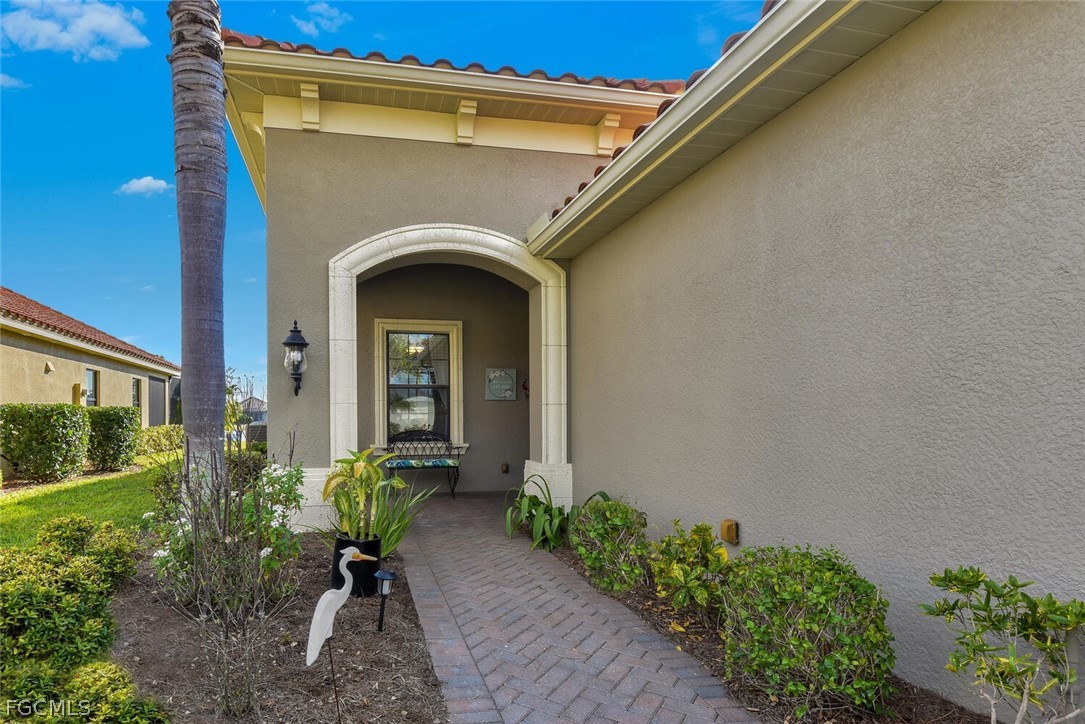 Amazing SWFL living in a waterfront villa! You will love watching the Florida sunrises from your private outdoor living space and enjoy the open concept living design that the interior of this home offers. Gently lived, meticulously cared for, and recent updates include new hot water heater & new dishwasher in 2025. From front entry you are greeted w/ a fresh coastal feel, beautiful flooring, French door entry to den, split bedroom floor plan, custom crown molding, tray ceiling in great room, high-end light fixtures & fans, designer cabinetry, and lots of natural lighting. The spacious outdoor living space includes a screened rear lanai w/ long covered sitting area, and a peaceful view of the lake. The open paver area is ideal for a grilling/smoker station. The backyard of the home has a side view of the lake. The builder installed a radiant barrier in the attic and an insulation barrier in the walls, keeping the house cooler & lowering the energy costs. Enjoy the active lifestyle of this Neal Community that features resort-style amenities including a state-of-the-art fitness center, clubhouse, community pool & spa with a fire pit area, basketball & tennis courts... all with low HOA fees and no CDD. This home is move in ready, and would be perfect as a second home to get out of the northern snow!