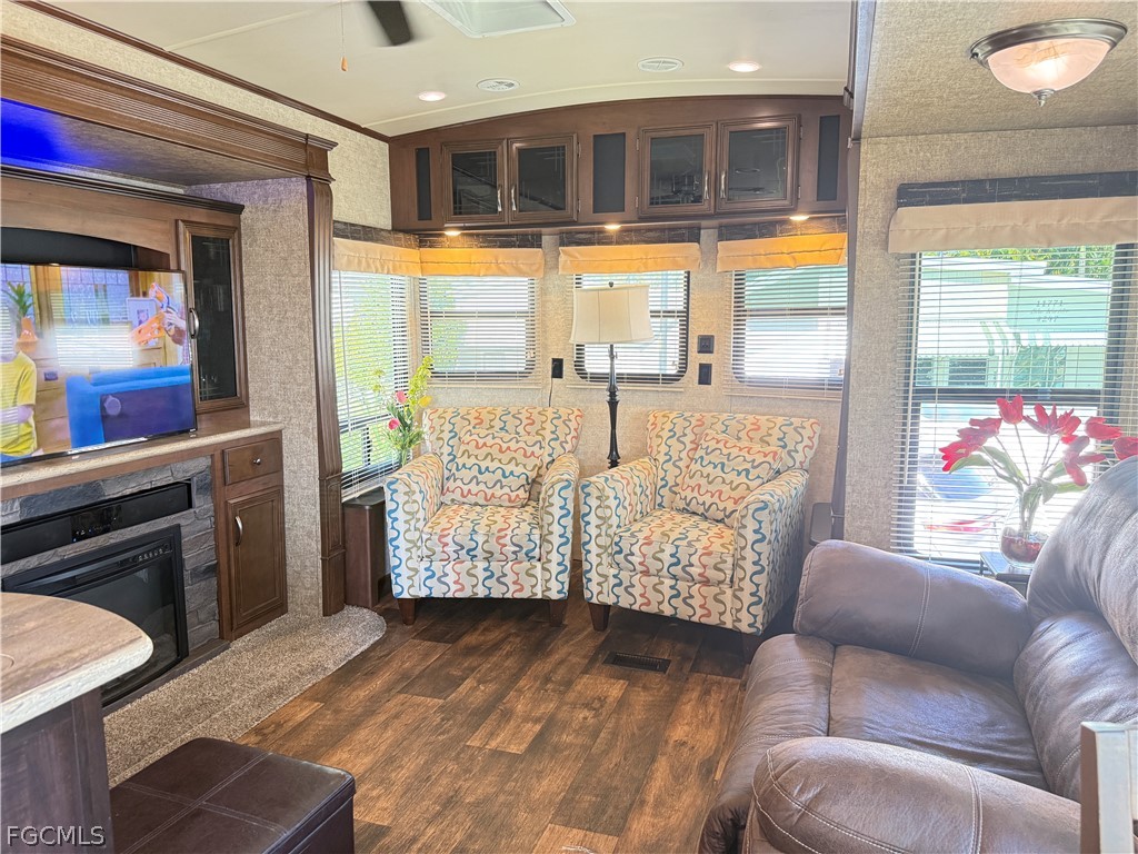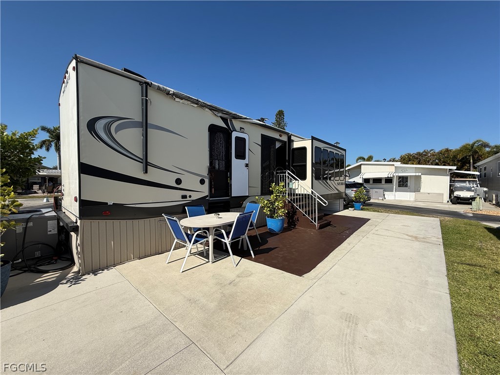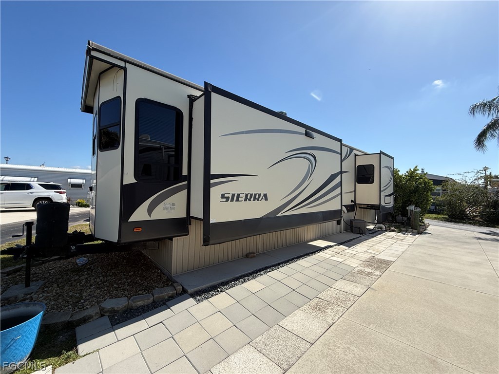 If you are looking for a BEAUTIFUL home in an all age park near Ft Myers Beach, Sanibel Island and Captiva Island, then look no further! This RV home is a 2017 and located in the highly sought after Holiday Condo RV Park. This home is luxurious and has a ton of wonderful upgrades including: wood laminate flooring throughout, stainless steel appliances, kitchen island, central vac, pendulum lighting, under cabinet and above cabinet lighting, great cabinet space in the kitchen, large step in shower in the bathroom, and a king size bed in the primary bedroom. The driveway is extra long and can hold up to 2 cars. The RV home has 2 A/C Units on the roof and has hurricane straps to secure it from hurricane winds. This home is being sold furnished and turnkey with everything you need to move right in and enjoy the amazing Florida weather! The driveway can also double as a patio with plenty of room to enjoy a cocktail, or cozy up to a great book. All of these pictures are post Ian. This home will definitely not last long. If you have always wanted to be near the beach, in fun community, and in a gorgeous home that is completely updated....then this home is for you! WELCOME TO PARADISE!