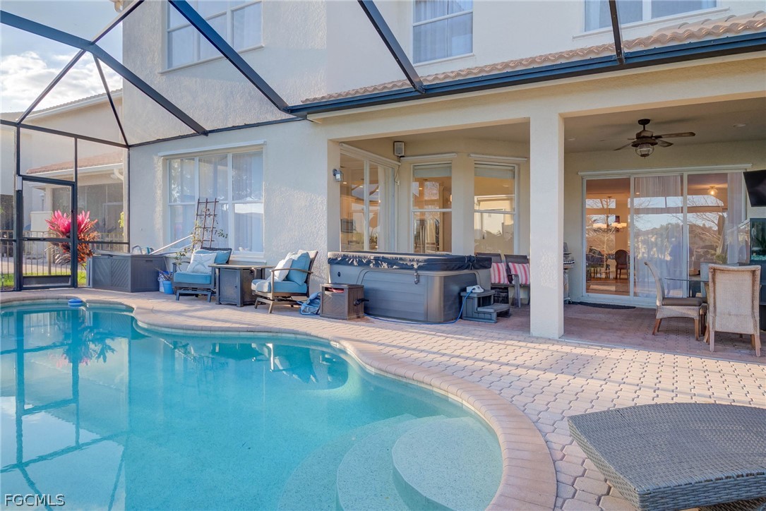 luxurious ensuite primary bedroom overlooks the lush landscaping, sparkling pool, and serene lake—a true retreat. Step outside to your southern-facing lanai, the perfect place to relax with a morning coffee or evening drink. Built in 2006 with solid concrete block construction, this home ensures privacy, peace, and durability. All furnishings are included! Community & Location: Gated, Family & Pet-Friendly