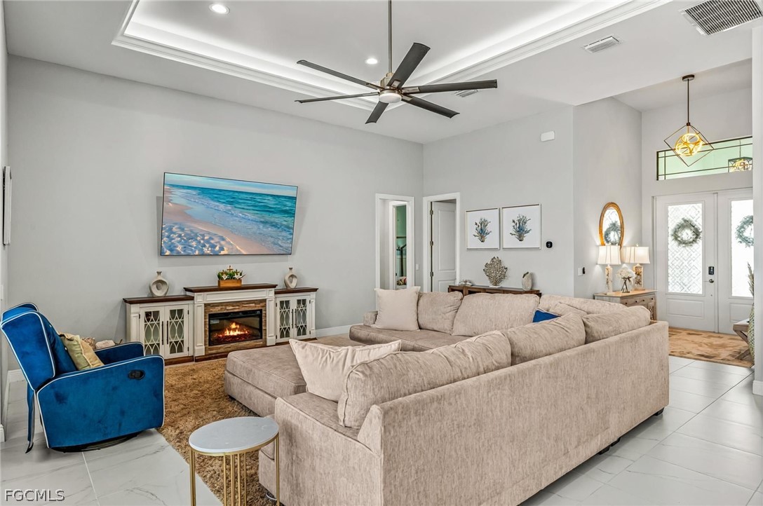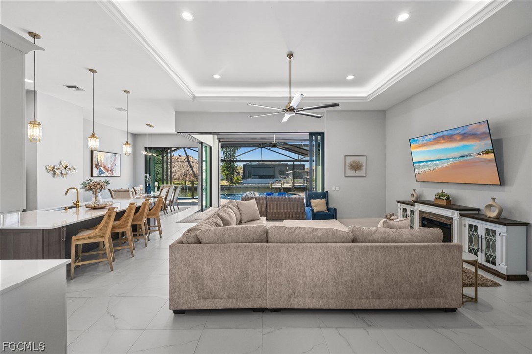 The open-concept interior features 12-foot ceilings with a 13-foot tray in the main living area and 10-foot ceilings throughout, complemented by oversized 24x24 matte-finish porcelain tile flooring. Integrated LED tray lighting is smartphone controlled. Impact-rated windows and doors are installed throughout. Zero-corner pocketing sliding glass doors retract fully to open the living area to the lanai. While the corner sliders are not impact-rated, they are storm protected since the covered lanai area is enclosed by electric roll-down Kevlar storm shutters, creating a protected space for outdoor furnishings during severe weather.