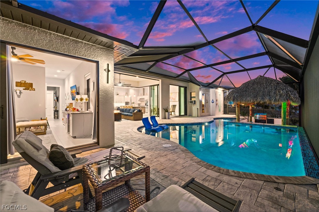 Western rear exposure provides sunset views from the custom pool and spa area. The screened outdoor space features a panoramic picture-window enclosure, paver deck, oversized spa, swim-up tiki hut bar with approximately 20 by 10 feet of thatched covering, wraparound bar seating, outdoor kitchen added in 2024, low-voltage lighting, outdoor shower, and mounted televisions in the lanai and tiki hut. The gas pool heater provides rapid heating and is managed through a Jandy AquaLink system controllable by phone.