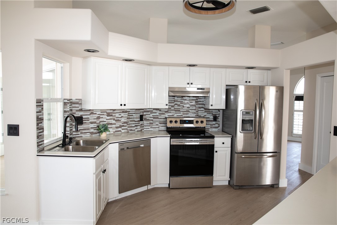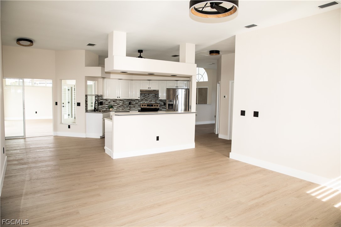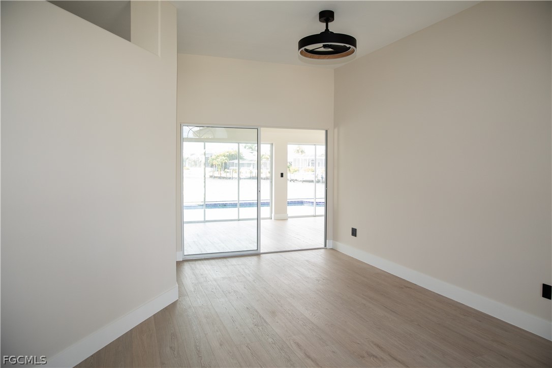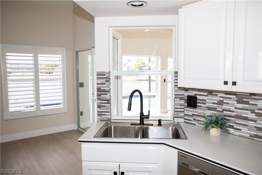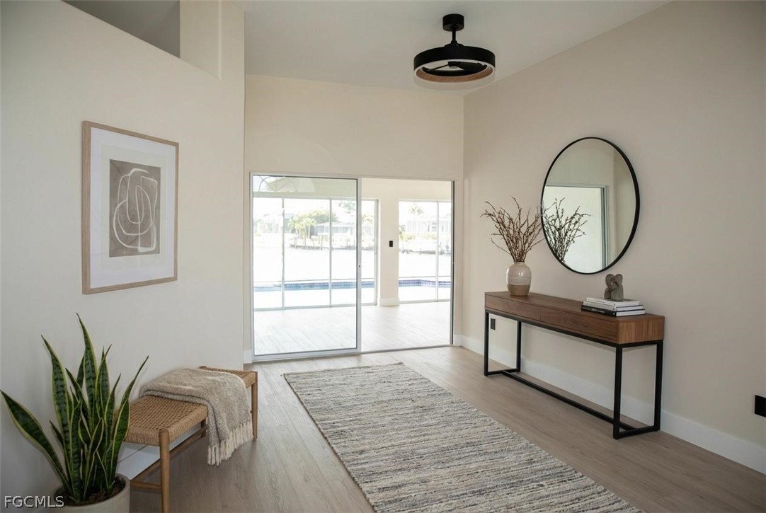 FULLY RENOVATED - Welcome to Waterview Haven, a truly exceptional waterfront residence ideally positioned at the intersection of three wide canals in the highly sought-after Southwest Cape Coral area. Set on a rare oversized, pie-shaped lot, this home offers breathtaking panoramic water views and front-row sunset scenery—paired with extensive recent upgrades that provide modern comfort and confidence. Extensive updates include: a new roof (2023), new pool cage and HVAC system (2024), new garage door, fencing, and water heater (2025), and a complete waterline repipe (2025). Extensively updated with luxury vinyl flooring, quartz bathroom countertops, new showers, upgraded faucets, modern ceiling lighting and fans, two new Smart TVs, fresh interior and exterior paint, new Plantation shutters, new garage door and numerous additional enhancements. From the moment you step through the double front doors, you are greeted by a bright, open floor plan with soaring ceilings and uninterrupted sightlines straight through the living area to the pool and expansive water beyond. The home features 3 bedrooms and 2 bathrooms across approximately 2,216 square feet of living space, thoughtfully designed with a split-bedroom layout for privacy and comfort. The spacious kitchen opens seamlessly to the family and dining areas, making it ideal for both everyday living and entertaining. With generous counter space, breakfast bar seating, and a welcoming dinette area, the kitchen invites you to enjoy morning coffee while watching boats pass and fish jump in the canal. One of the home’s standout features is the large, air-conditioned sunroom, offering incredible water views and spectacular sunsets year-round. This versatile space is perfect for relaxing or hosting guests and can easily be converted back to an open lanai if desired. Outside, the screened pool and panoramic pool cage create a serene waterfront retreat with unobstructed views in every direction. The fully fenced, oversized yard provides exceptional outdoor living potential—lush, private, and spacious enough for entertaining, play, pets, or future enhancements such as a fire pit or seating area. A concrete dock along the seawall offers a perfect spot for fishing, lounging, or enjoying life on the water, with Gulf access via intersecting canals. Located on a quiet, peaceful street surrounded by upscale waterfront homes, this property offers the perfect balance of privacy, community, and convenience. Whether you’re seeking a full-time residence, a seasonal retreat, or a waterfront lifestyle investment, Waterview Haven is a rare opportunity to own a truly special piece of Cape Coral waterfront living. Schedule your private showing today and experience the sunsets for yourself.