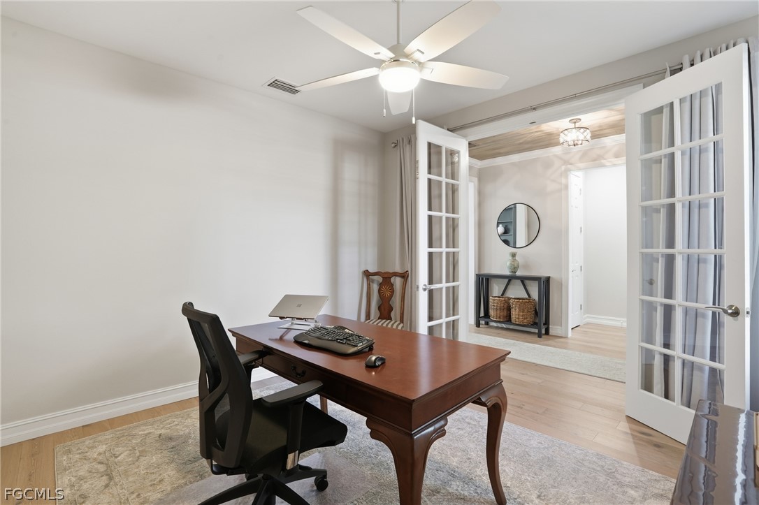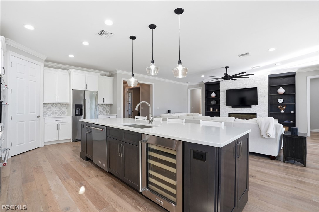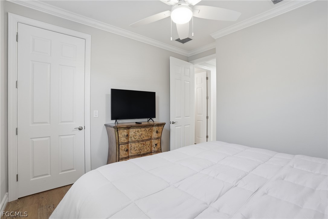 Welcome to this beautifully maintained home located in the highly sought-after community of Bridgetown at The Plantation in Fort Myers. It is not in a flood zone! This residence offers a bright, open layout designed for comfortable everyday living and effortless entertaining. There is a beautiful electric fireplace with custom shelving. The spacious kitchen features plenty of cabinets with a pantry and a functional island that flows seamlessly into the main living area. A generous primary suite provides a peaceful retreat with a well-appointed on-suite bath and a custom walk-in closet. Additional highlights include solid wood engineered European oak floors, custom woodworking and crown molding throughout. Step outside to a private lanai with travertine tile deck overlooking the water, and heated salt-water pool with spa. The beautifully maintained landscaping allows for privacy on the back lanai. It is the perfect spot to relax and enjoy the outdoor living! The yard is nicely landscaped with LED lighting in the front and back of the home. Residents enjoy access to exceptional amenities, including clubhouse, resort-style pool, fitness center, tennis, optional golf membership, all within minutes of the interstate, shopping, dining, RSW Airport, and the best of Southwest Florida living. This home is move-in ready and offers an outstanding opportunity in a prime location. Don't wait to see it!