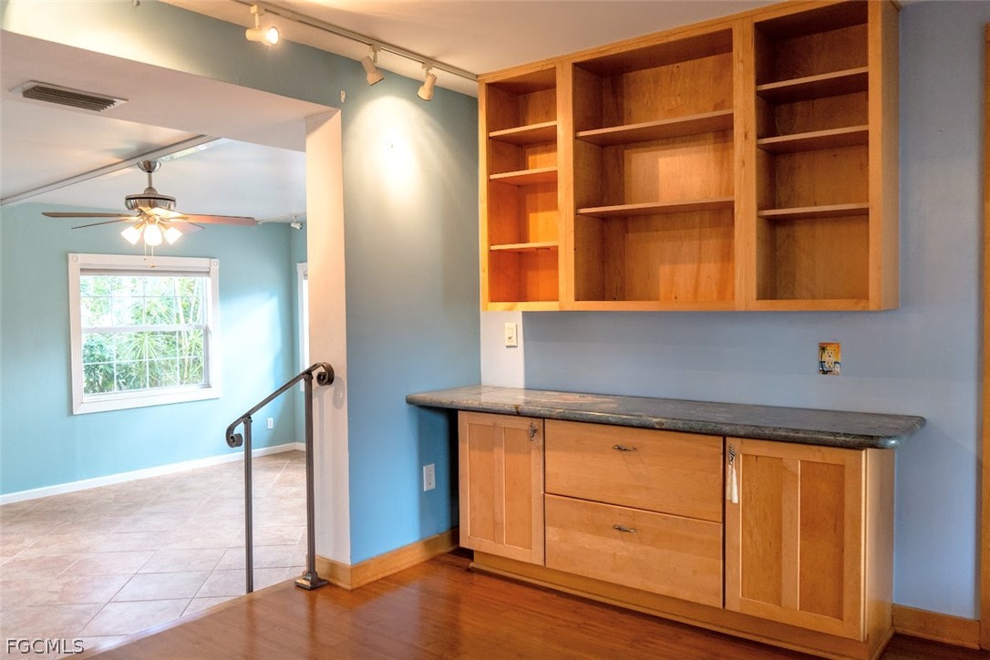 Inside, the home features a functional kitchen with gas stove, built-in microwave, double-door refrigerator, deep double-bowl sink with modern spray faucet, attractive backsplash, built-in pantry with sliding doors, wood cabinetry, deep cabinet drawers, and a custom buffet with wall-mounted bookshelves. Accent lighting and an open pass-through connect the kitchen to the spacious enclosed Florida room.