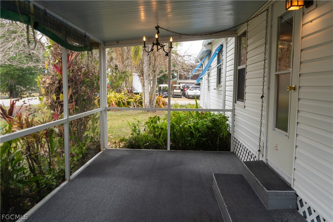 Additional highlights include central air conditioning and a screened front porch with roll-down curtains and decorative chandelier.
