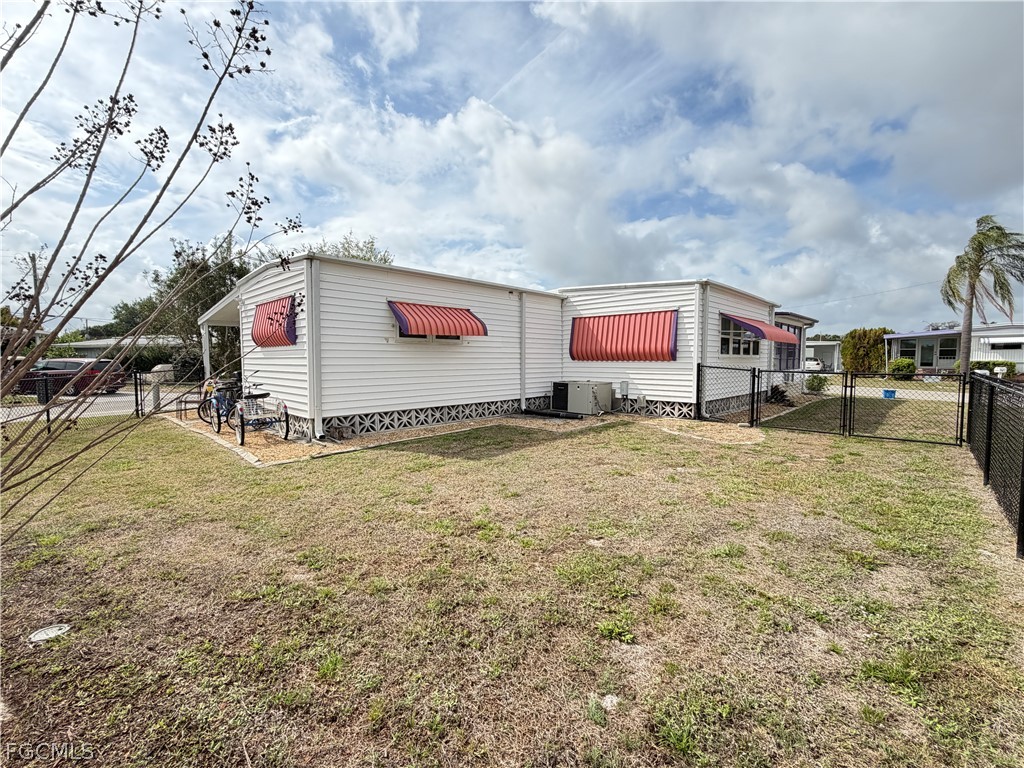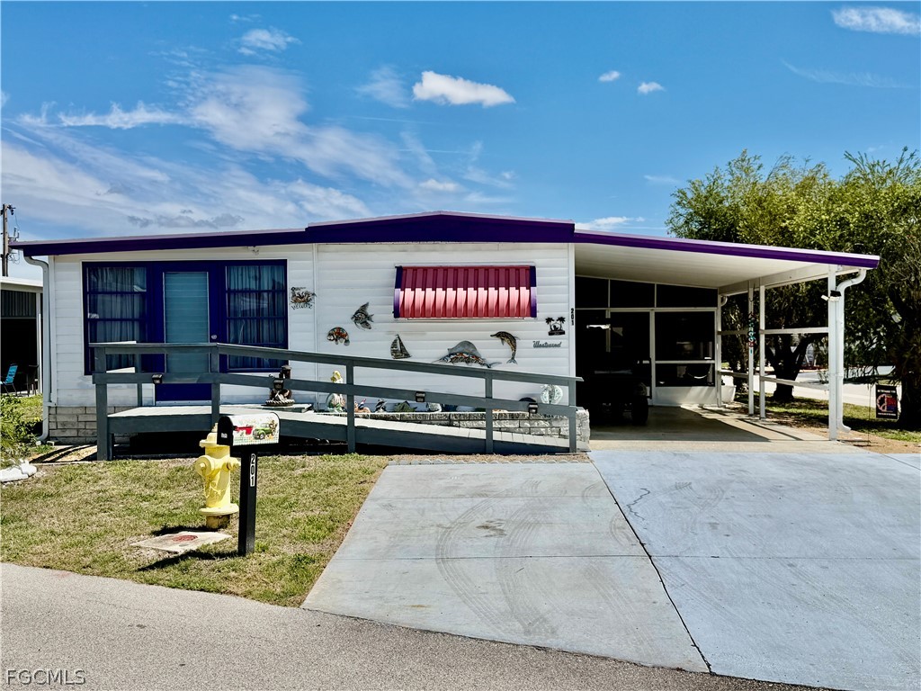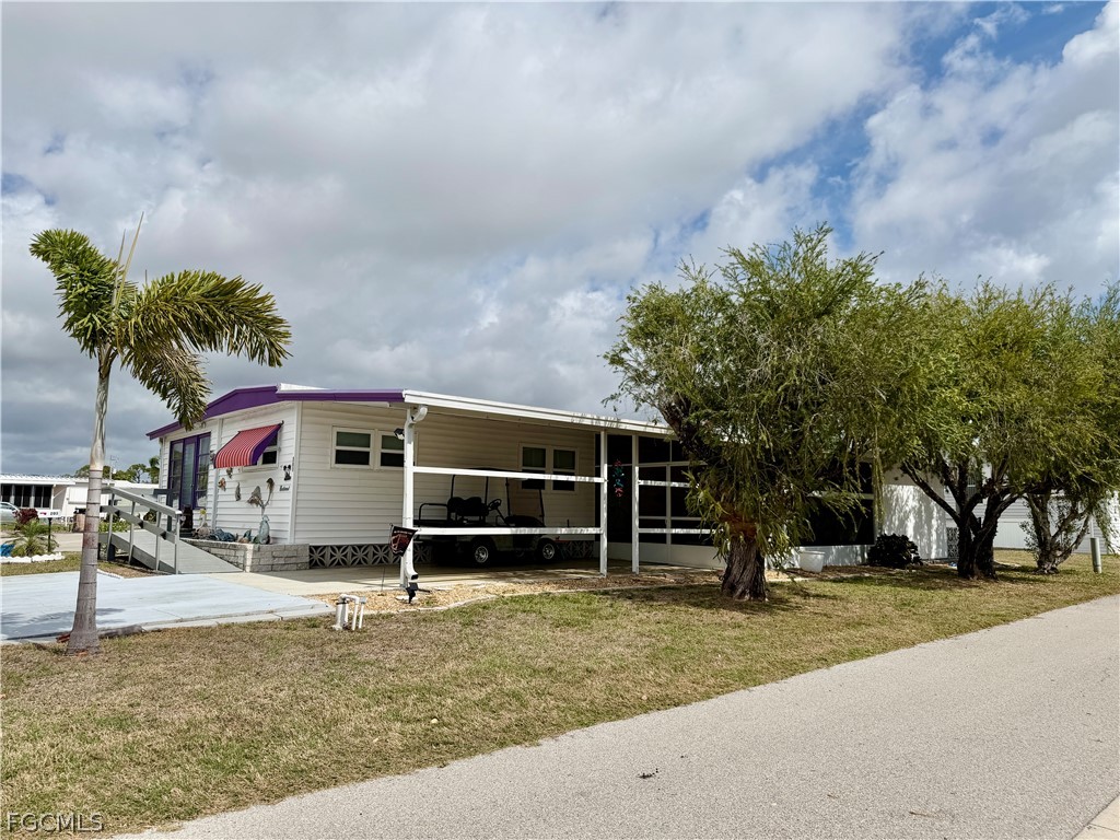 This charming home has 2 bedrooms, 2 baths and a bonus room with a split floor plan. Turnkey, move-in ready home is situated on a corner lot with fenced yard. Located in Carriage Village, an active 55+ pet friendly community. OWN YOUR LAND and maintenance fee is $95/month. Very wide driveway for extra parking. Screened lanai for extra living space to enjoy our Florida weather. Double doors give access for golf cart when needed. New LVP flooring (2024). Fence (2024). Windows (2019) and has been replumbed. Vapor Barrier (2020). Utility shed with Washer (2021) & Dryer. Wheelchair ramp accessible (2020). Home has lots of natural light. Survey available. Freshly painted awnings around home for added sun and weather protection. Golf Cart & Bikes included in sale. Community has so many amenities including large, heated pool, clubhouse, hobby shop, billiards, library and more. Great place to live year-round or as a second home for warmer weather.