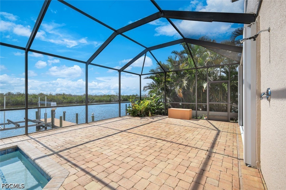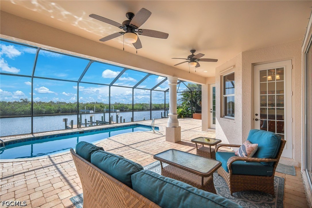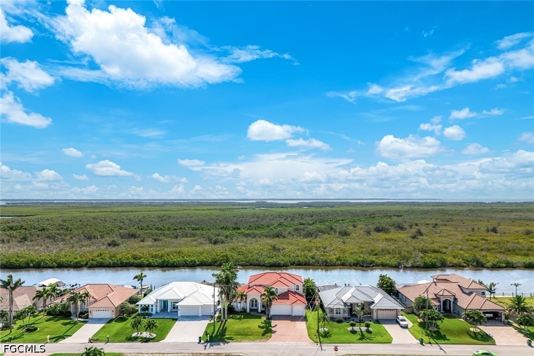 If you value privacy, deep wide water canal with no bridges to world class fishing and beaches, beautiful sunsets in a custom-built one-of-a-kind home this can be yours. Located on the spreader "rim" canal across from a state preserve, no structures will ever be built to obstruct your view or privacy. The home has an east-west exposure to enjoy world class sunsets and experience the Florida lifestyle. Enjoy a short 20-minute boat ride to Matlacha and open water with no bridges. This one owner home is built with quality throughout, the home is thoughtfully designed and features a grand great room with soaring 20-foot ceilings and views straight out to the water. The main bedroom is located on the first floor for easy living. The kitchen features wood cabinets, pull outs with dovetail drawers and & "blue eye" exotic granite counter tops. Upstairs there is another living area and a large, screened balcony to overlook the water and watch the eagle soar. Outdoors there is a large pool area with brick paver decking, great for watching dolphin and manatee swim. Cruise to the gulf - no bridges from the dock with a 10,000-pound lift. The home features a tile roof that was replaced in 2022 as well as a three-car garage. The home has always been high and dry. There are impact windows upstairs and shutters which provide you with peace of mind for the future. If you are tired of the modern white boxes and looking for a charming home with some individuality, come see this home. This currently the lowest priced home on the spreader canal! Don't miss the opportunity to come and live your dream.