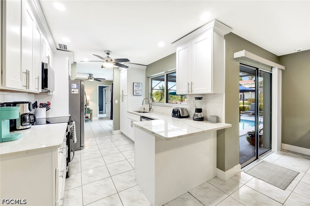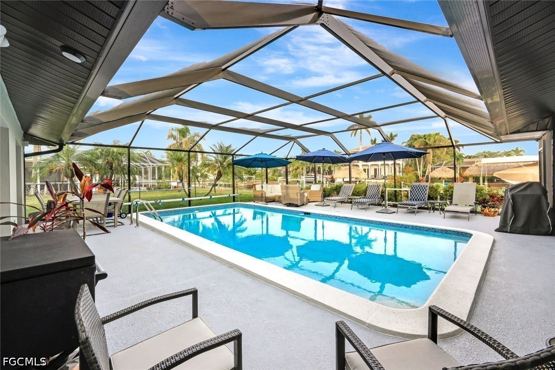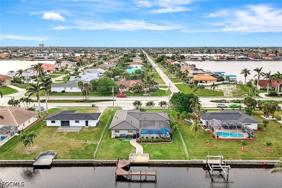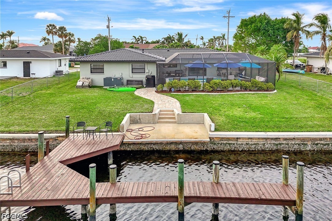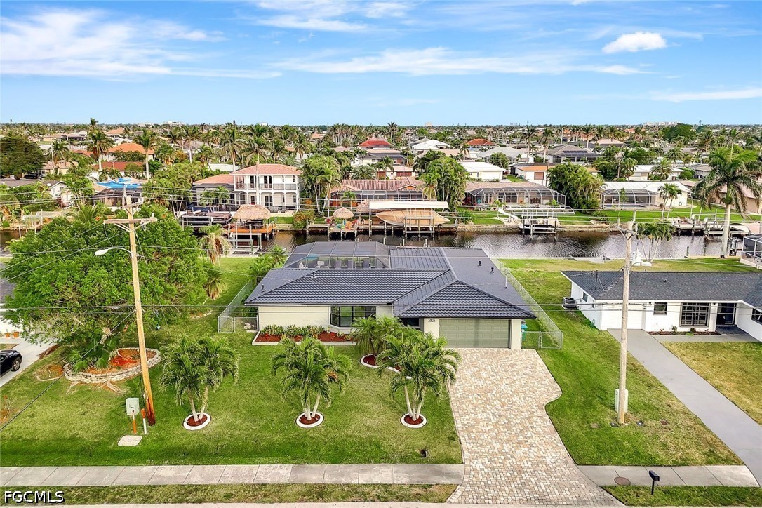 SAILBOAT ACCESS POOL HOME LOCATED ON THE PELICAN FINGERS! Discover waterfront luxury in this stunning 4-bedroom, 3-bathroom sailboat-access pool home, perfectly situated in the prestigious Pelican Blvd area of South Cape Coral. A newer metal roof (2023) and professional landscaping with a pavered driveway (2020) add to the home's curb appeal. The entire exterior was stripped and repainted in 2024, while the interior was also freshly repainted (2024). Inside, the straight-stacked tile flooring flows seamlessly throughout, leading to a bright front living room with a stylish brick and wood accent ledge and a coat closet at the entryway. The kitchen is a chef’s dream, featuring ceiling-height white shaker cabinets with sleek silver pulls, a white subway tile backsplash, granite countertops, stainless steel appliances (2022), and a pass-through window with water views, perfect for entertaining. The primary suite features private lanai access, a spacious ensuite with dual sinks, and a fully tiled walk-in shower. The fourth bedroom also has private lanai access, overlooking the pool and water, making it ideal for guests or a home office. A dedicated pool bathroom includes a floor-to-ceiling tiled shower. The pool was recoated in 2022 and is heated, perfect for year-round enjoyment. The backyard is fully fenced and now features new sprinkler system (2024) to keep the landscaping lush. Additional upgrades include new lanai (2023), garage door (2022), water heater (2024), and washer and dryer (2024). For boating enthusiasts, the property includes a private dock, boat slip, and a 13,500 lb boat lift that needs to be permitted and installed (supplies are onsite). The pavered walkway leads from the home to the dock, making waterfront access effortless. This home is not just a property; it’s a lifestyle. This location offers premium boating access and convenient access to shopping, dining and entertainment as its just a short boat ride to Tarpon Point! Be sure to check out nearby Rotary Park for the stunning Butterfly Garden, Children's playground, Dog Park, mangrove boardwalk and more - all within walking distance! You deserve everything that SWFL has to offer: temperate weather year round, boating, kayaking, jet skiing, world class fishing and white sandy beaches at your fingertips!