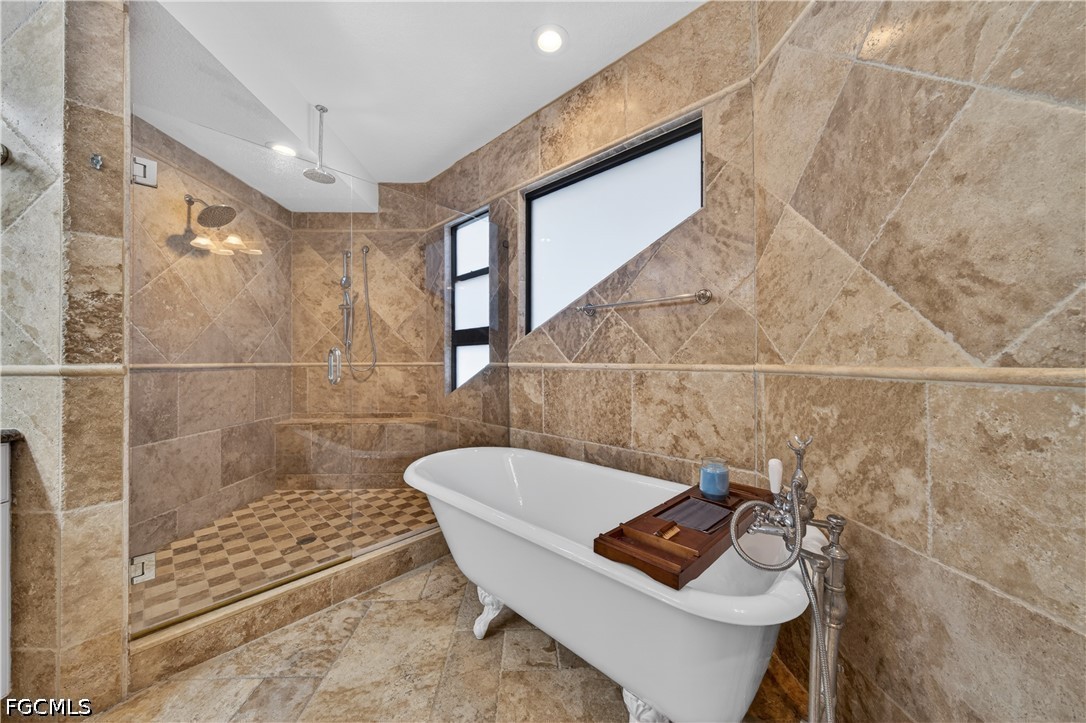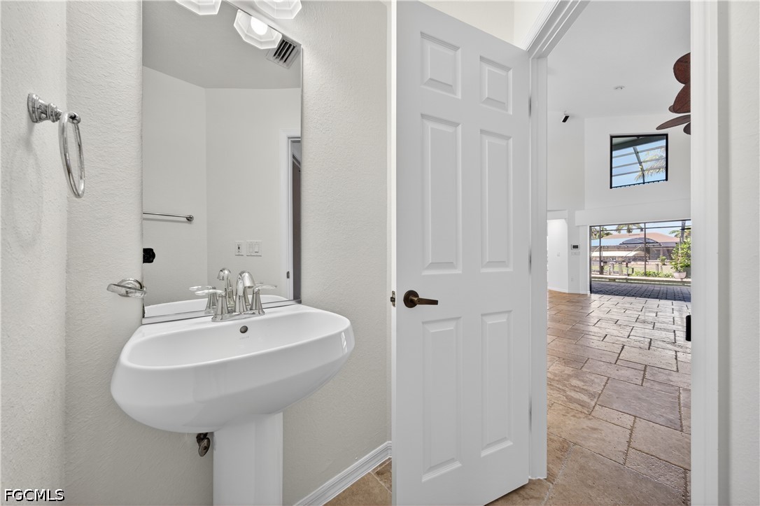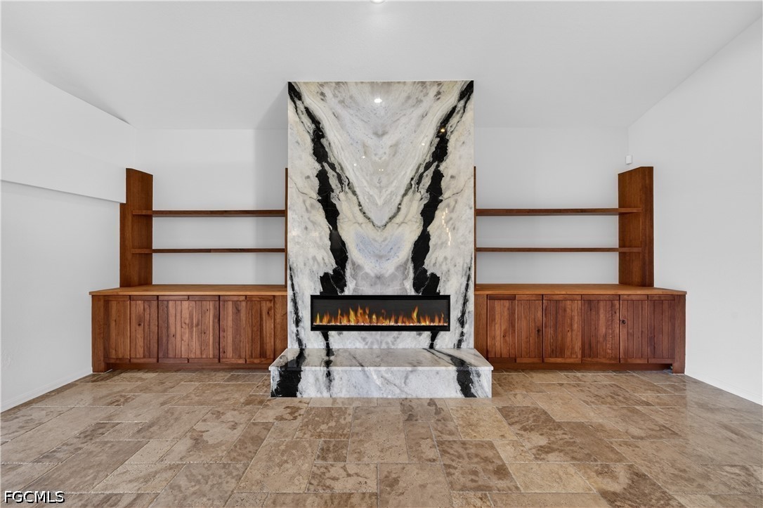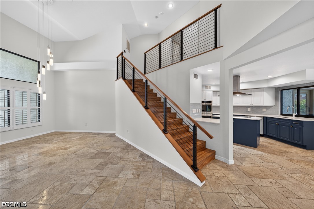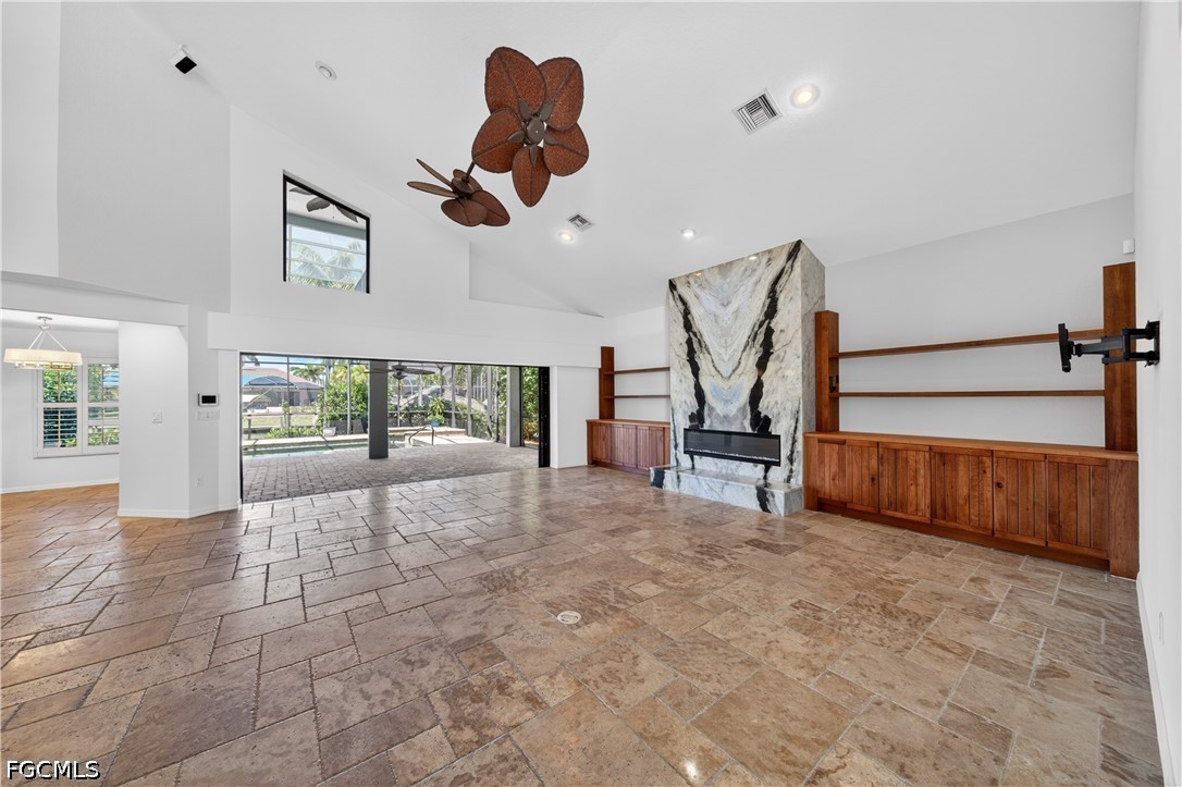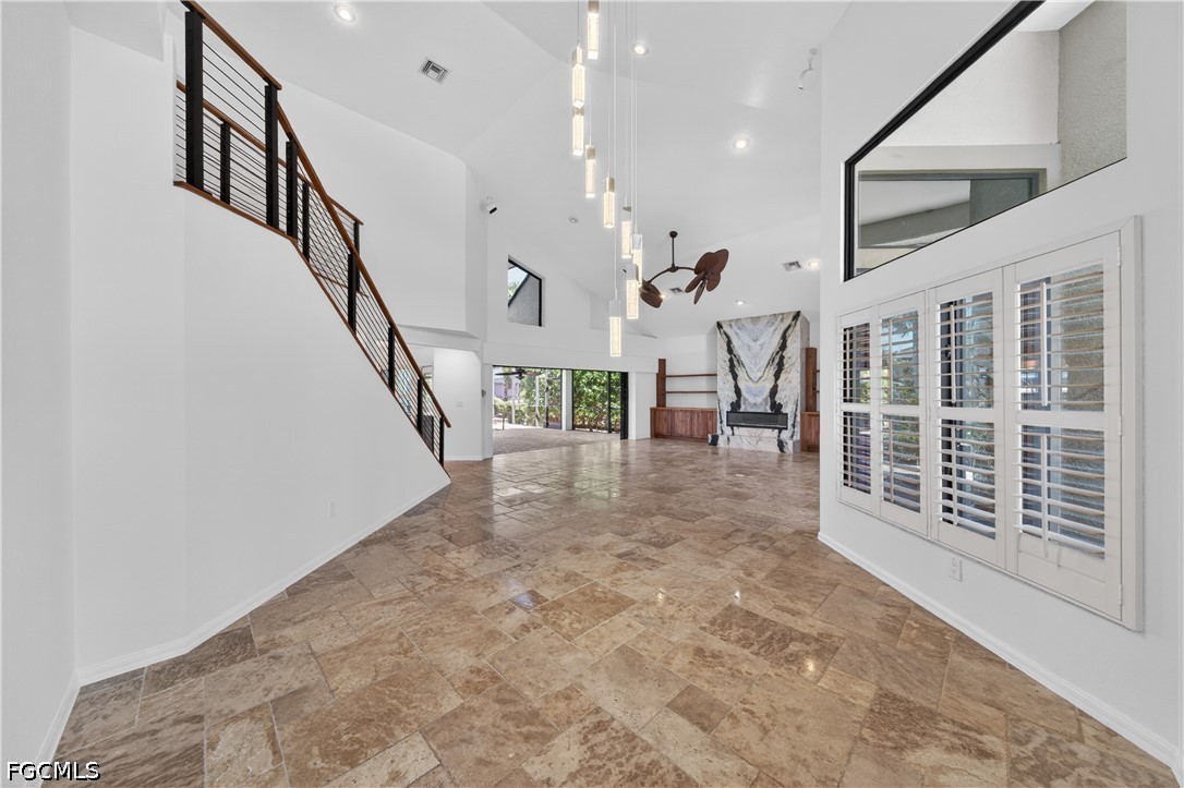 The home itself is surrounded by lush, mature tropical landscaping with towering Royal and Caloosa palms, creating a private resort-style setting around the HEATED POOL AND SPA. A beautiful paver driveway leads to an impressive entrance opening into soaring ceilings and spacious living areas finished with travertine flooring.